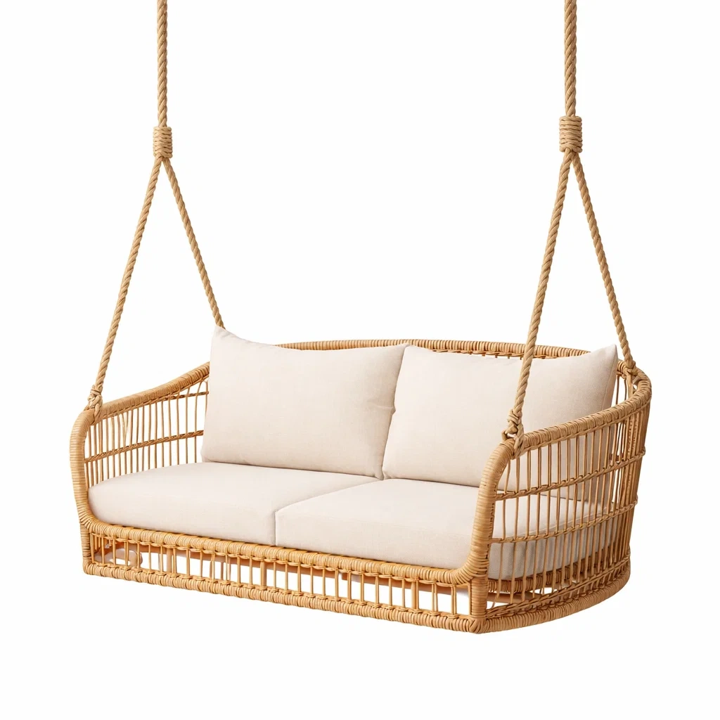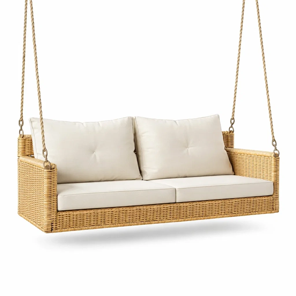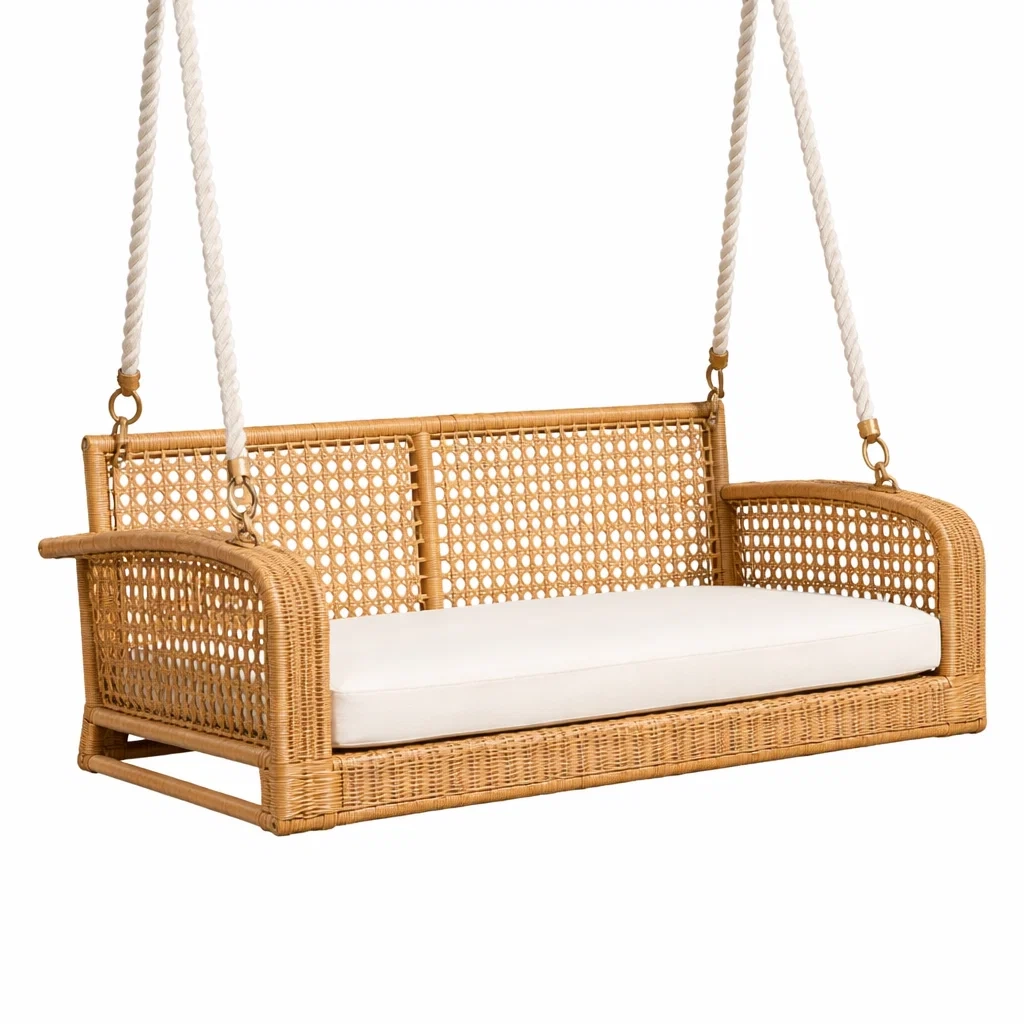 Balancelle de porche en rotin avec coussin en tissu blanc