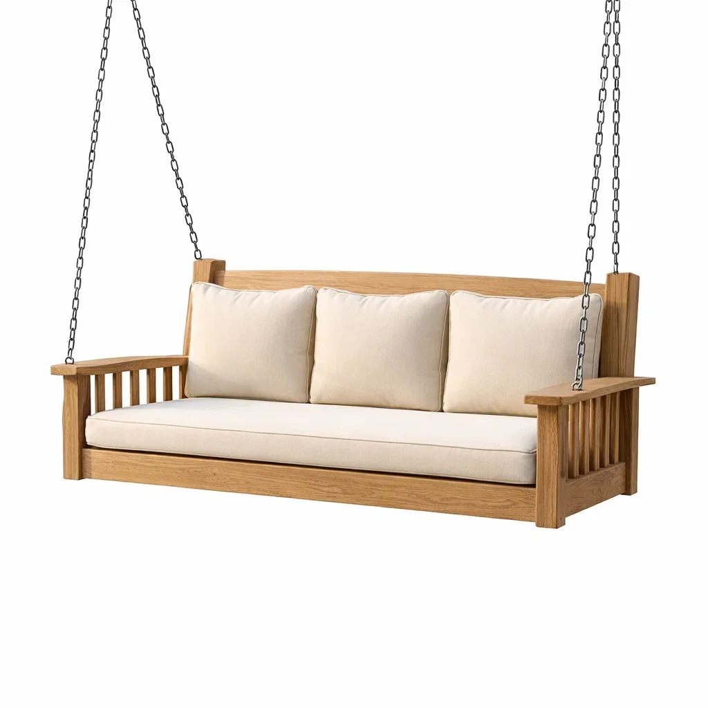 Balancelle de porche en bois de teck avec coussins en polyester beiges